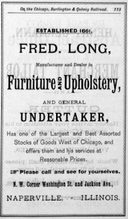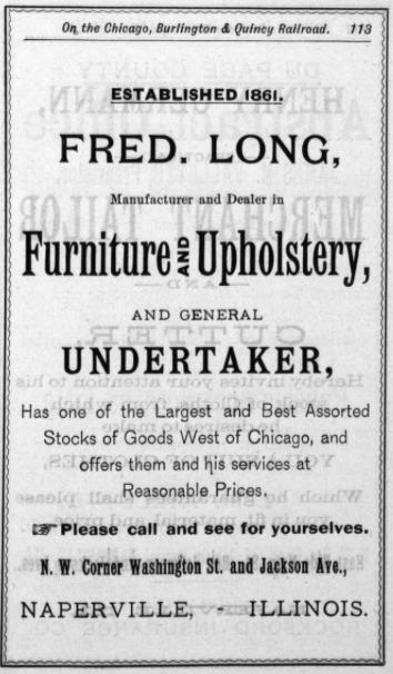 Fred and Amelia’s only son, Charles, died at age 30, married, but childless. One of Amelia’s nephews, Oliver Beidelman, who was already working with Uncle Fred, wound up taking over the furniture and the undertaking businesses, passing both along to other family members. It was Oliver who, along with his son “Dutch,” built the brick Beidelman’s Furniture store that is currently on the corner of Washington Street and Jackson Avenue, replacing the shop pictured in the 1874 Atlas. While the funeral parlor space there is still visible, the Beidelman funeral business moved to another downtown location and one in south Naperville.
