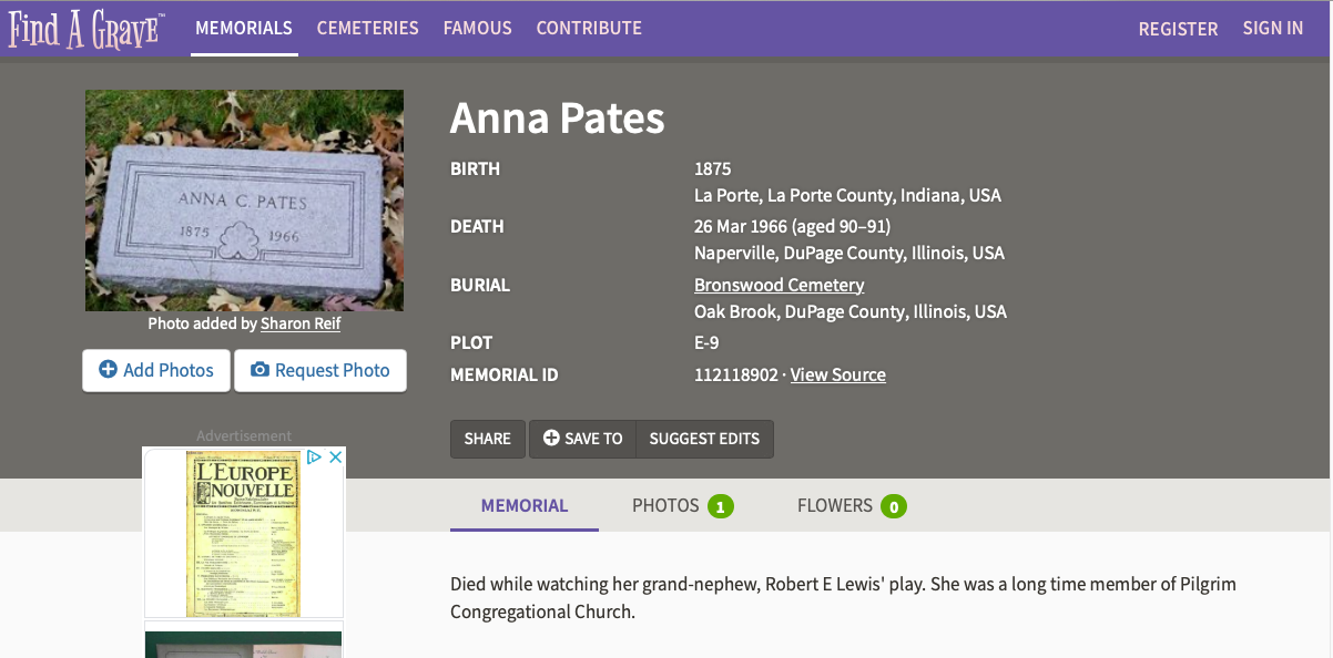 Family trees and census records prove the connection between Oak Park, Lewis, and Pates. A Chicago Tribune article announced the debut of “Bligh Me” in the March 24 issue. Pate’s obituary says she passed “suddenly” on March 26. And several family members have even written about the event online. While it’s interesting to confirm the facts of the story, whether Aunt Anna is actually haunting Pfeiffer Hall as the Lady in White is of course quite another matter! The next time you attend an event there, maybe you can find out for sure…